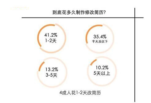 根據(jù)調(diào)查顯示,41.2%的人制作修改簡(jiǎn)歷需要1-2天;35.4%受訪者表示制作與修改簡(jiǎn)歷的時(shí)間在半天左右;有10.2%的人制作修改簡(jiǎn)歷的時(shí)間在5天以上。
